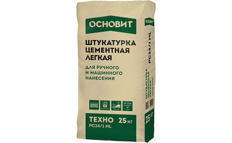 Штукатурка цементная легкая ТЕХНО PC24/1 ML предназначена для выравнивания стен из бетона, кирпича, ячеистого бетона.